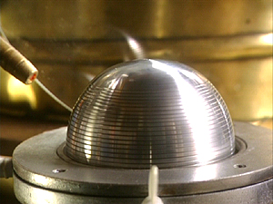 On the table is a pillow, on that is a brass ball. About the size of a volleyball.