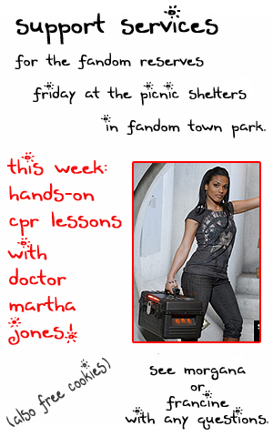 "The Fandom Reserve Support Services group will be having Dr. Martha Jones as a special guest today, who'll be giving mouth to mouth resuscitation lessons." Since she had an extra poster, she held it up. "Everybody's welcome."