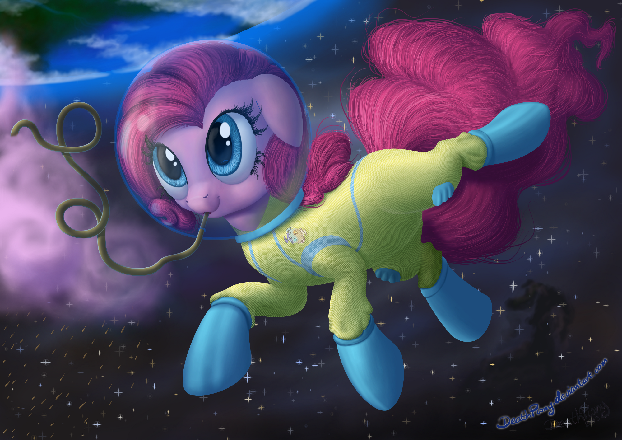 Pinkie Pie was wearing a space suit. And apparently actually floating around the room, today. What was a little gravity between friends, really?
