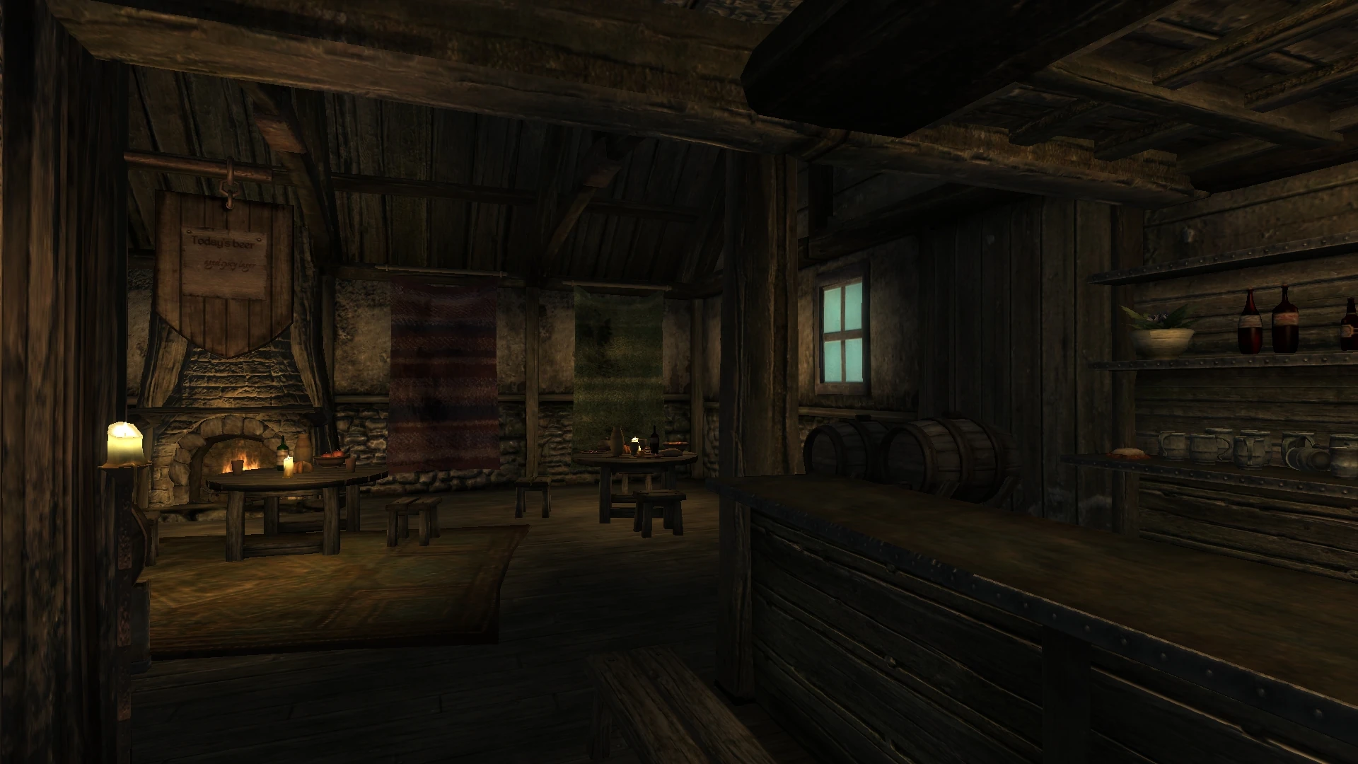 The surly barkeep is standing between them and the crowd, holding a club in his hands in warning.
