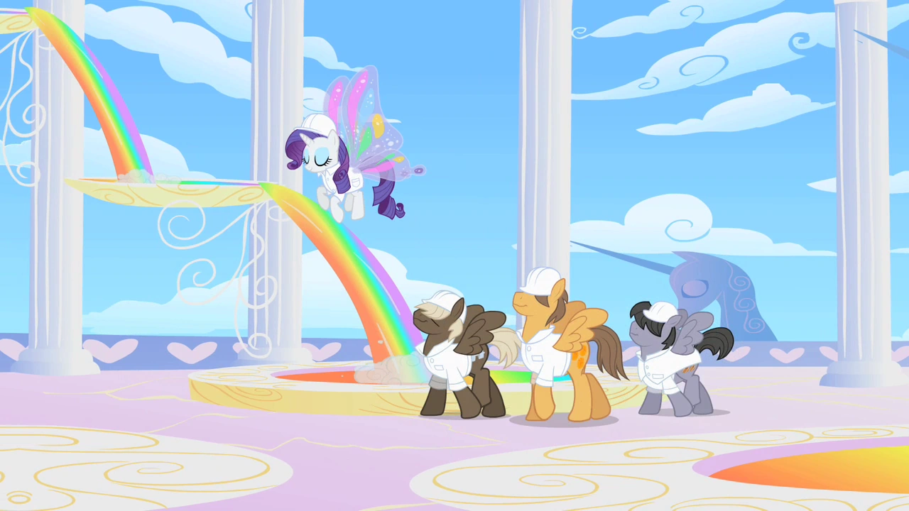 "Now, Cloudsdale is a unique city in Equestria, not just because it's populated entirely by pegasuses. It's also the only city that actually travels around! It can float anywhere that needs it, which is everywhere, because Cloudsdale's number one industry is weather making!" Pinkie led the way to a complex, open air factory, where she paused, pulling a box of white hard hats out of . . . somewhere. "Safety first! Weather can get pretty exciting, even when it's just being manufactured! There's loads of places in here to explore, so split up if you want and have fun! Just be sure not to touch anything that a pegasus hasn't told you is okay to touch, and whatever you do, don't taste the rainbows!"