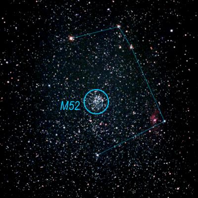 "There are several interesting objects in Cassiopeia, like Messier Object #52, or "M52," one of many "M" objects named after a catalog published in the late 1700's by the Frenchman Charles Messier. Messier was a comet hunter of great renown who published a catalog of fuzzy things that might be confused with comets. These ended up being some of the most interesting objects in the sky. When you find M52 you are looking at a "young" cluster of about 200 stars -- young means that it is only about 100 million years old. The cluster is 10 light years in diameter and 3000 light years away from us, which is why you need the binoculars to see it.