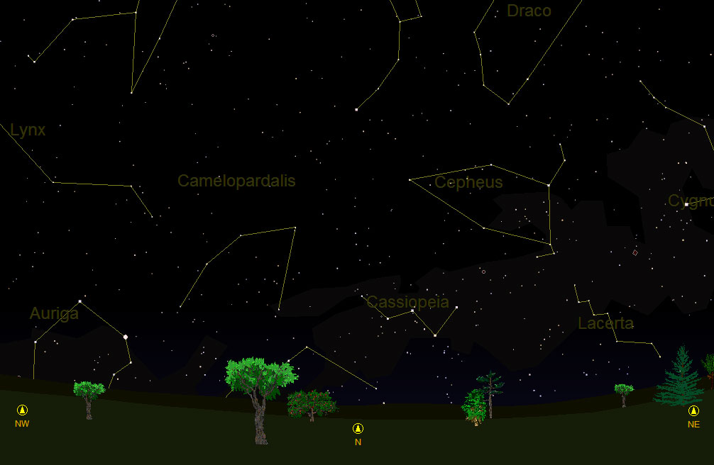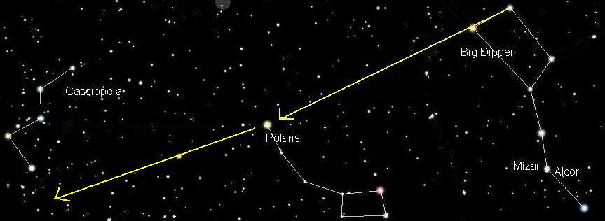 "The Big Dipper can also help you find Cassiopeia, the Queen. She and the Big Dipper are always on opposite sides of Polaris. Draw that imaginary line I just mentioned from the Big Dipper to Polaris and keep going. The line will pass just below Cassiopeia, who looks like the letter "W" or "M." Cassiopeia is an ancient queen, reclining in her chair.