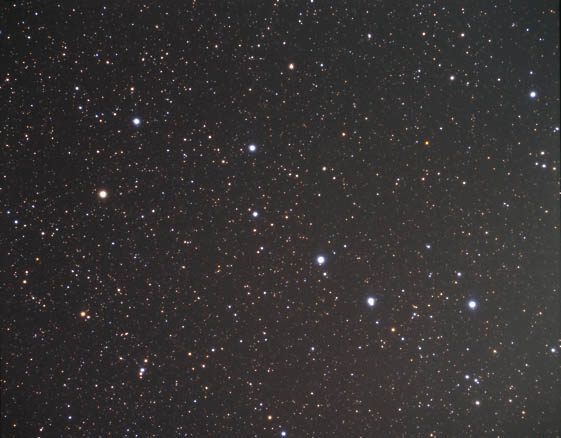 "We can find two of the best and brightest galaxies in the sky just above the two stars that form the neck of the Ursa Major -- they are M81 and its neighbor M82. Use the binoculars and follow the line of the Bear's neck to a skinny triangle, then go sideways to find a pair of stars that point the same direction as the triangle does. Just a little farther you find M81, a faint fuzzy spot just off the end of the arc of three faint stars nearby. See it? This faint fuzzy spot is a huge galaxy, 4.5 MILLION light years away -- about twice as far away as the Andromeda galaxy. There are actually two galaxies there. The other one is M82 and it is much flatter than M81. It is also much farther -- about four times as far, 16 million light years away.