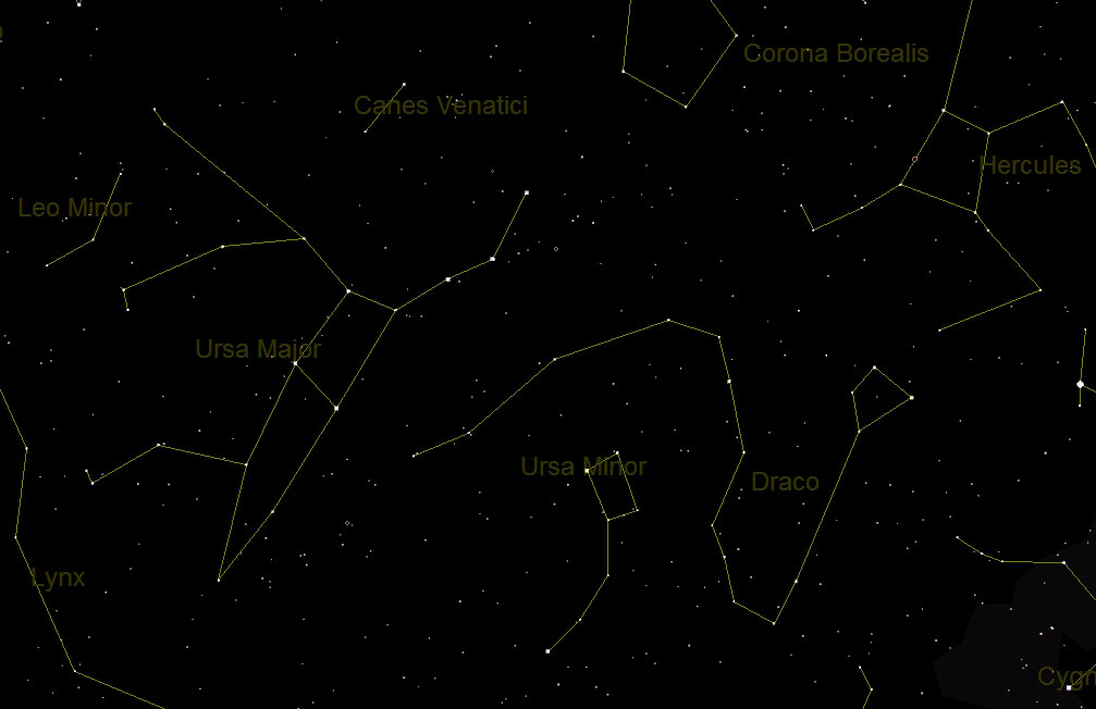 "Tonight we're going to start with three of the easiest constellations to spot. You probably already know them. Look up and find the Big Dipper. It looks like a ladle, scooping up the stars. The Big Dipper is not actually a constellation. It's an asterism, which is a pattern of stars within or part of a constellation. Interestingly, in other parts of the world, these seven stars are known not as a Dipper, but as some sort of a wagon. In Ireland, for instance, it was recognized as "King David's Chariot," from one of that island's early kings; in France, it was the "Great Chariot." And in the British Isles, these seven stars are known widely as "The Plough."
