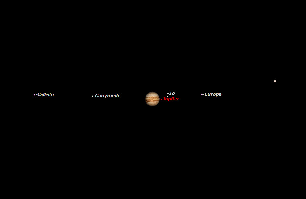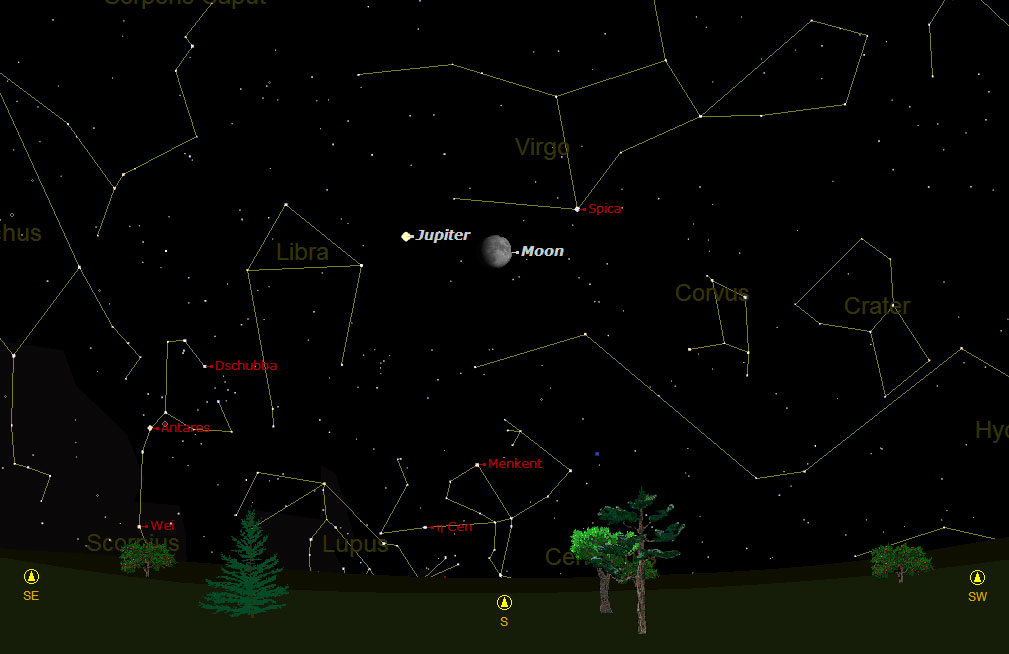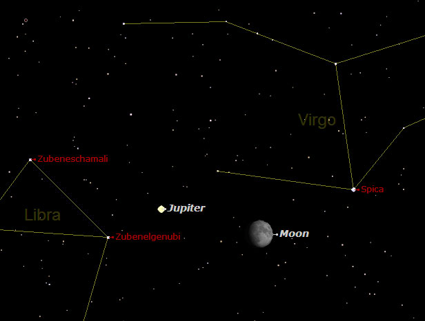 "Now look over to Virgo and the moon. That very bright "star" to the left of the moon is Jupiter. Jupiter is the fifth planet from the Sun and by far the largest within the solar system. It is usually the fourth brightest object in the sky (after the Sun, the Moon and Venus); however at times Mars appears brighter. Jupiter is 2.5 times more massive than all the other planets combined, and it is 318 times more massive than Earth, with a diameter 11 times that of Earth, and with a volume 1300 times that of Earth. Its best known feature is the Great Red Spot, a storm larger than Earth which was first observed by Galileo four centuries ago. Some astronomers have termed Jupiter as a "failed star." If Jupiter had been more massive and become a star, life on earth would be very different.