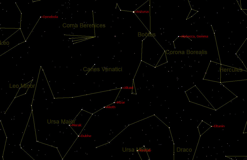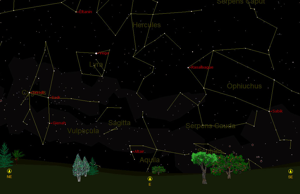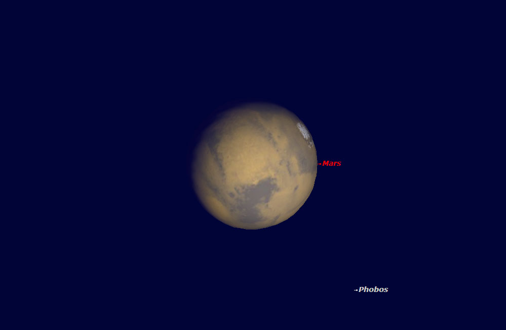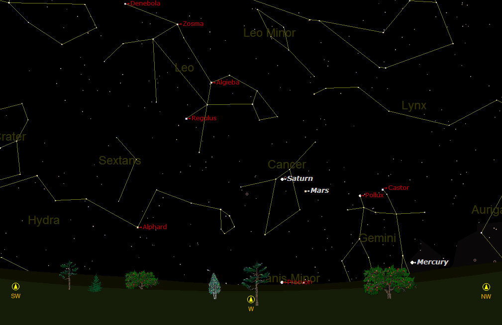 "Now look west and find Cancer. Saturn is in the top middle of the "shell," and Mars, the red "star," is to the right. Mars was named for the Roman god of War, in part due to its red color, the color of blood. The color is caused by the iron oxide, or rust, on the planet's surface. Mars is half the size of the Earth, but its surface area is only slightly less than the total area of Earth's dry land. Mars has an atmosphere that is primarily carbon dioxide, but as this atmosphere is so thin, it does not retain heat like ours does. Some evidence suggests that the planet once was significantly more habitable than today, but the question on whether living organisms ever actually existed there is an open one. We've sent many probes to Mars, but so far we have no conclusive proof.