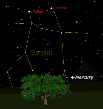"Four out of the five planets visible with the naked eye are in the sky tonight. We'll start with Mercury first since it's going to set soon. Find Gemini on the northwestern horizon. Below and to the right of Mebsuta, the star that makes up the waist of Castor (he's the twin on the right), you can find the planet Mercury. Mercury is the planet closest to the sun and orbits once every 88 days. Mercury can only be seen at sunrise or sunset because of its closeness to the sun. The planet is heavily cratered, like the moon, and has no atmosphere. It was named after the Roman messenger god for its swift path across the sky. You won't see as good a view as the picture in your handout, not with binoculars, but with the telescopes if you take astronomy in the fall we can try for a better look.