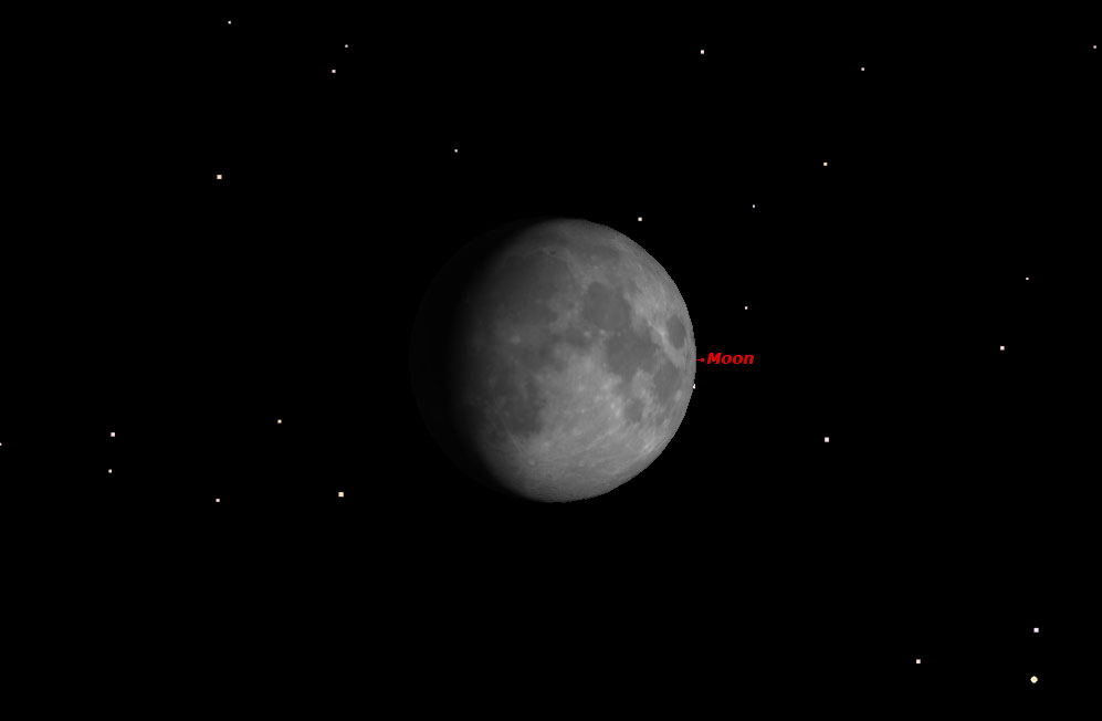 "And now to the Moon, Earth's only natural satellite. I don't think I have to tell you how to find it! The Moon is in synchronous rotation, meaning that it keeps nearly the same face turned toward Earth at all times. The side of the Moon that faces Earth is called the near side, and the opposite side is called the dark side or the far side. The Moon makes a complete orbit about the Earth approximately once every 27.3 days. Right now the Moon is waxing gibbous and is just over 11 days old.