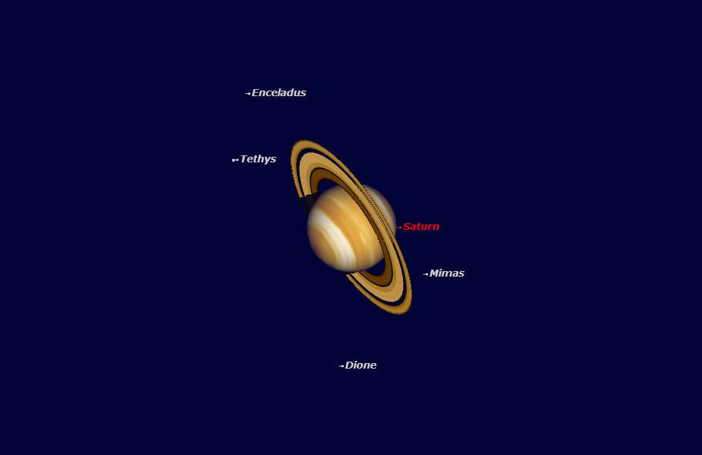 "Above and to the left of Mars we can find Saturn, the sixth planet from the Sun. It is a gas giant (also known as a Jovian planet), the second-largest planet in the solar system after Jupiter. Saturn has a prominent system of rings, consisting mostly of ice particles with a smaller amount of rocky debris and dust. The rings were first seen by Galileo through his telescope. He thought that "Saturn has ears"!